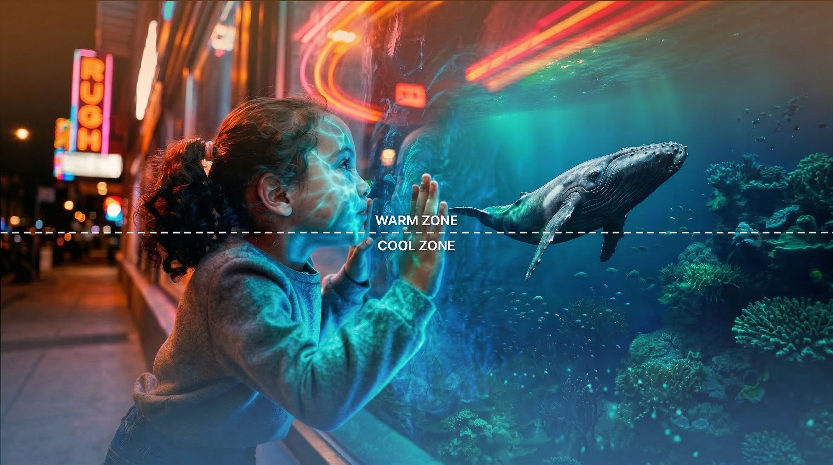 Look at the top of the image. See the neon signs? Orange, pink, warm yellow. Now look at the bottom. Cool blue-green ocean, coral reef, whale.