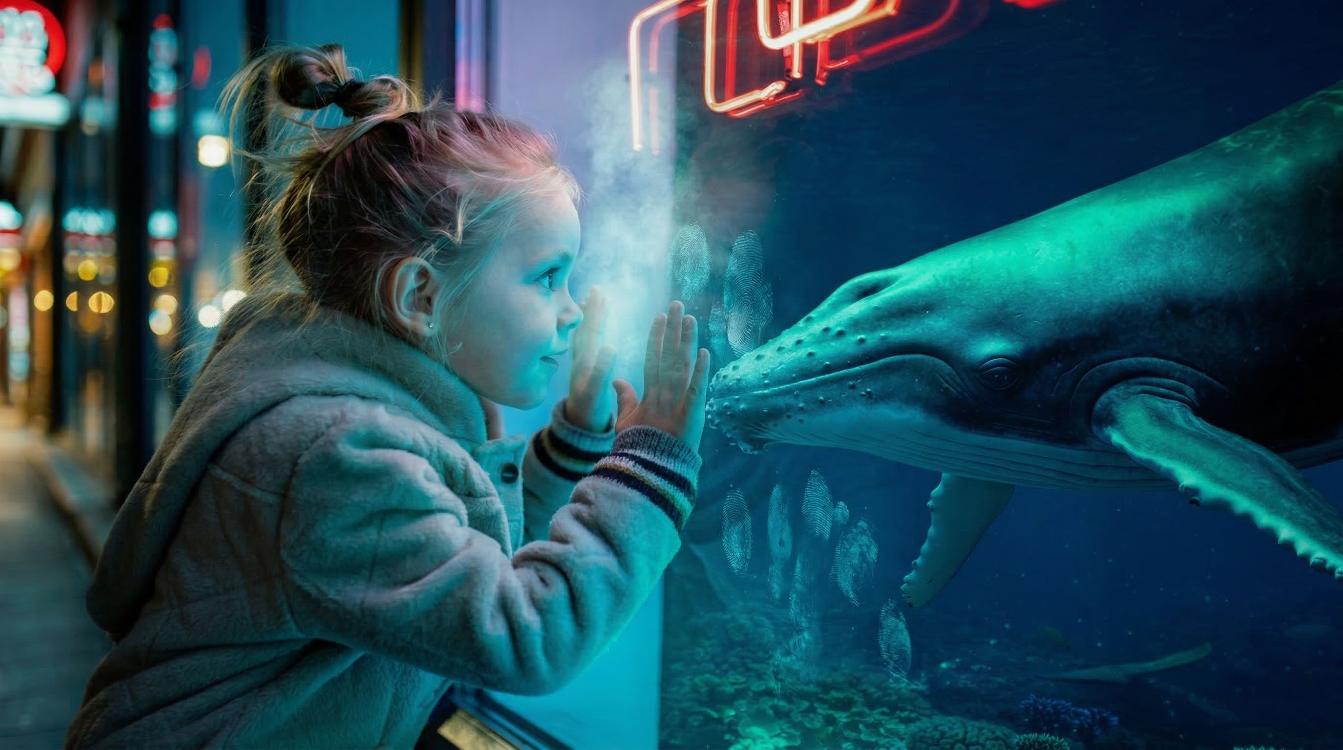 Not literally. There's no drawn line separating the two halves. But the image has a natural horizontal division. Above the midpoint: warm neon world, street at night, the glow of commerce and city life. Below the midpoint: cool underwater world, coral, whale, the quiet of the deep ocean.