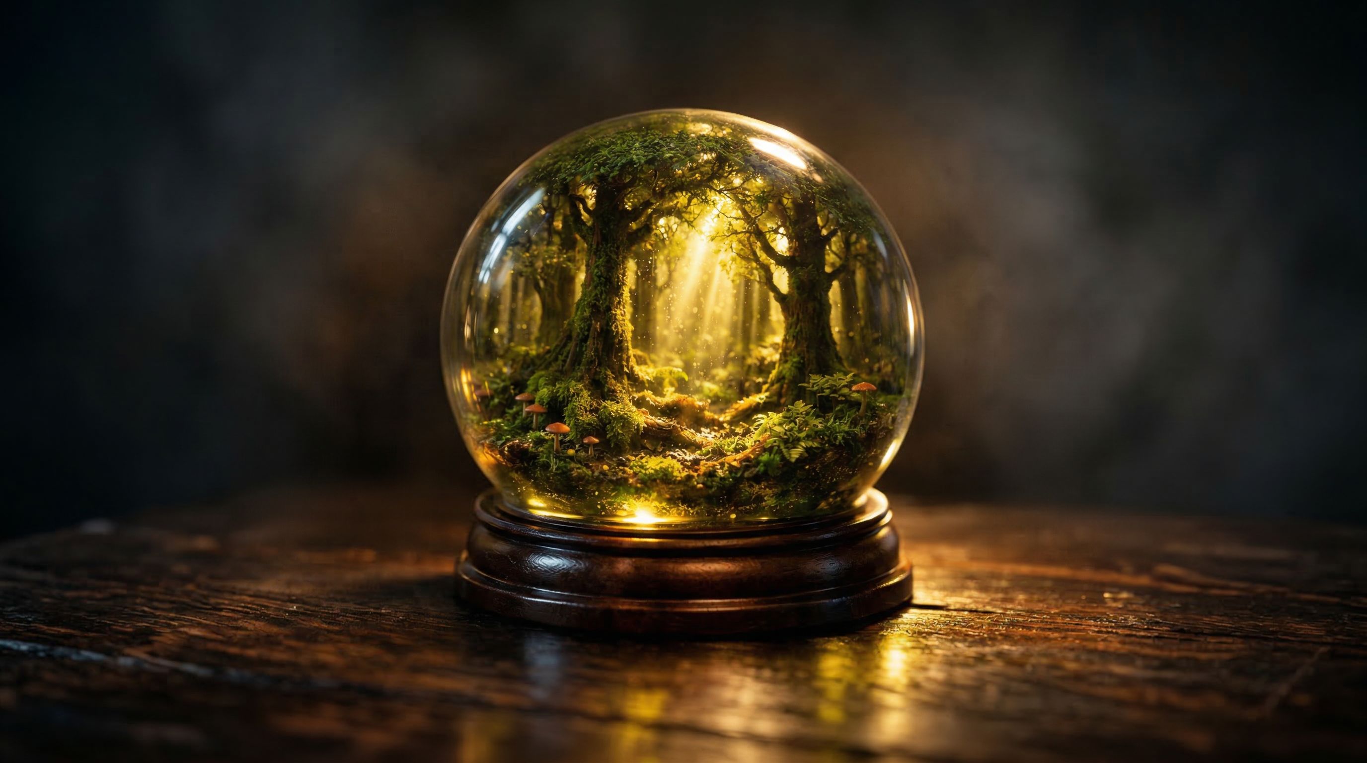 3. Trees pressing against curved glass create compression tension. This is a compositional principle. Ancient trees with thick trunks and spreading canopies fill the sphere edge to edge. Branches press against the inside of the glass. Roots curl along the bottom. The contained world feels too large for its container, which creates visual tension that reads as dramatic at any viewing size. The thunderstorm lacks this because clouds and lightning are formless. The coral reef has some of it with coral structures, but trees are more structurally rigid and press harder against boundaries.
