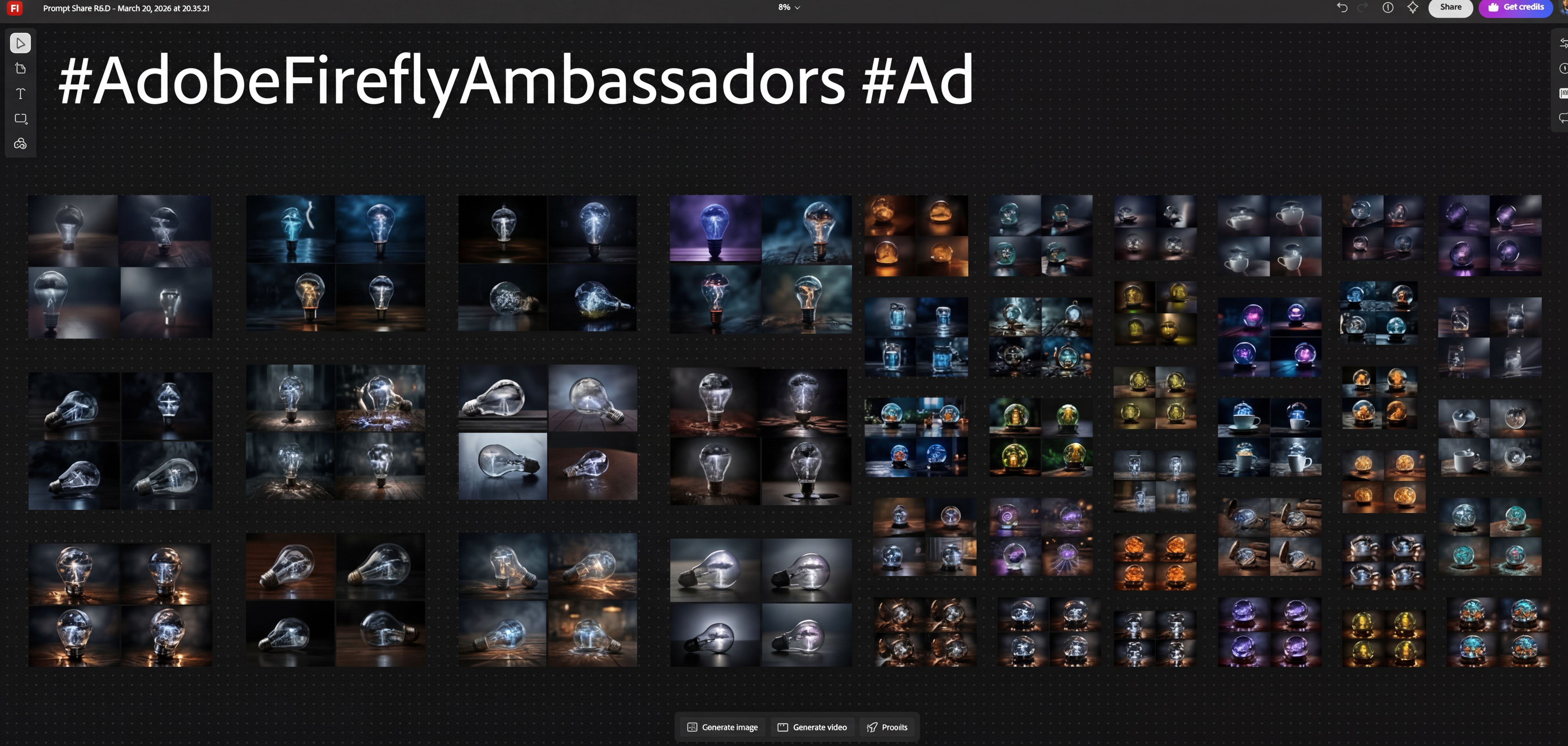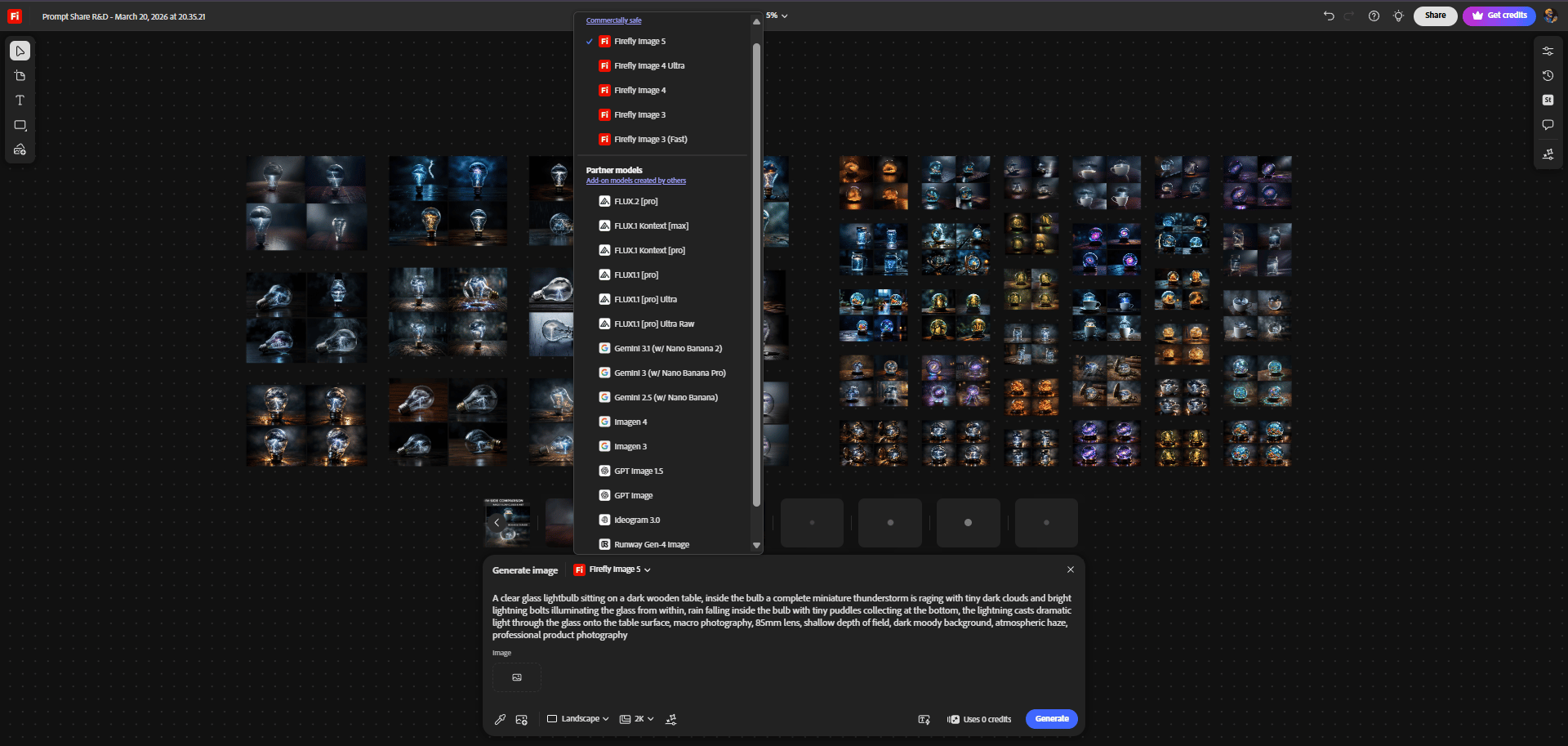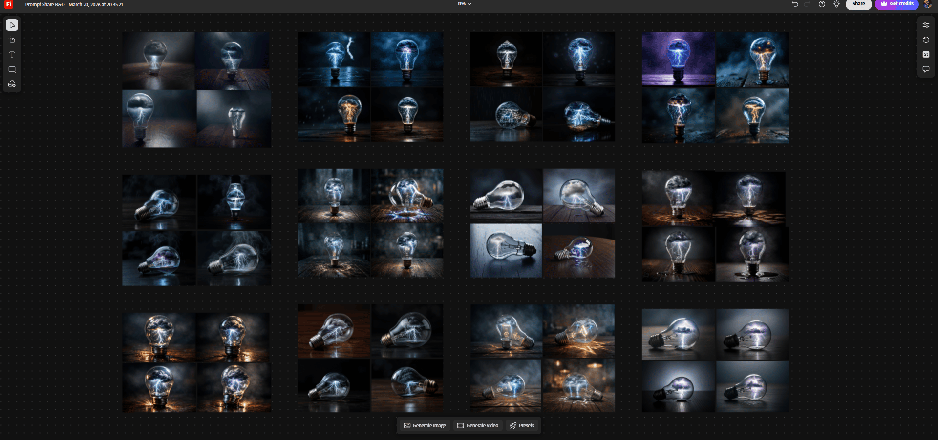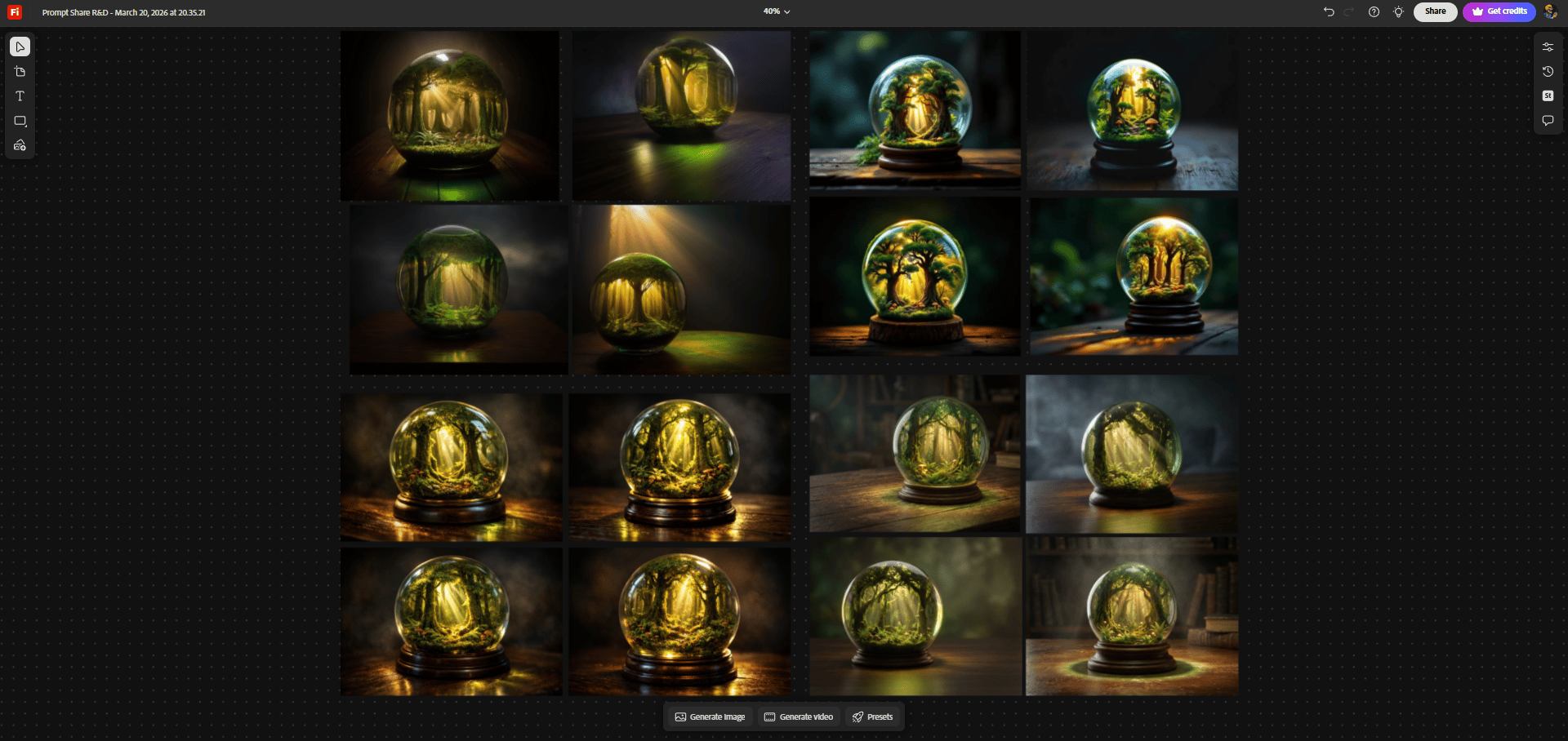 Session persistence. Every generation stays in the workspace. By the end of the Miniature Worlds session I had 176 images across three rounds, all visible. I could scroll back from the forest globe (Round 3) to the original lightbulb (Round 1) and see the entire evolution of the concept in one place. That visual history is the R&D record.