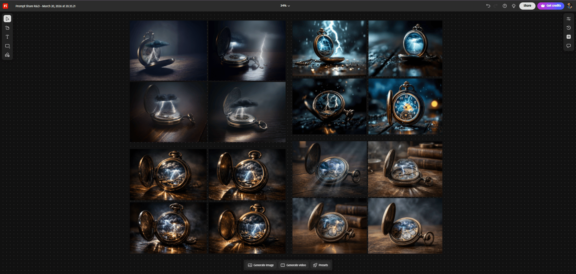 I narrowed the field to four models (GPT Image 1.5, Firefly Image 5, Flux 1.1 Pro, Nano Banana Pro) and kept the thunderstorm but changed the container. Mason jar. Snow globe. Coffee cup. Pocket watch. Four images per model per container. Sixty-four more images, all generated and compared in Boards.