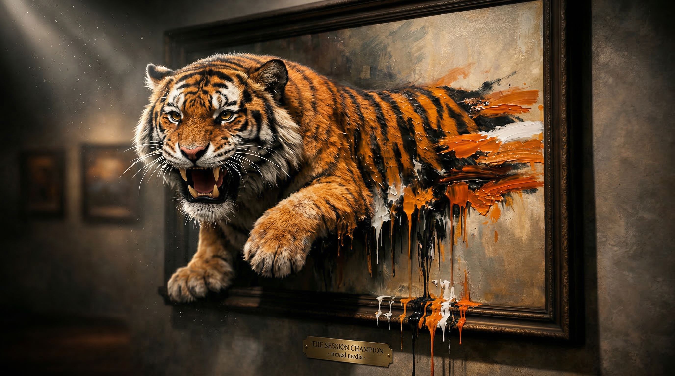 The concept seemed simple enough. A tiger stepping out of an oil painting. Front half: photorealistic fur. Back half: visible brushstrokes on canvas. Paint dripping at the transition point where one reality becomes another. One prompt. One image. Two visual languages coexisting in a single frame.
