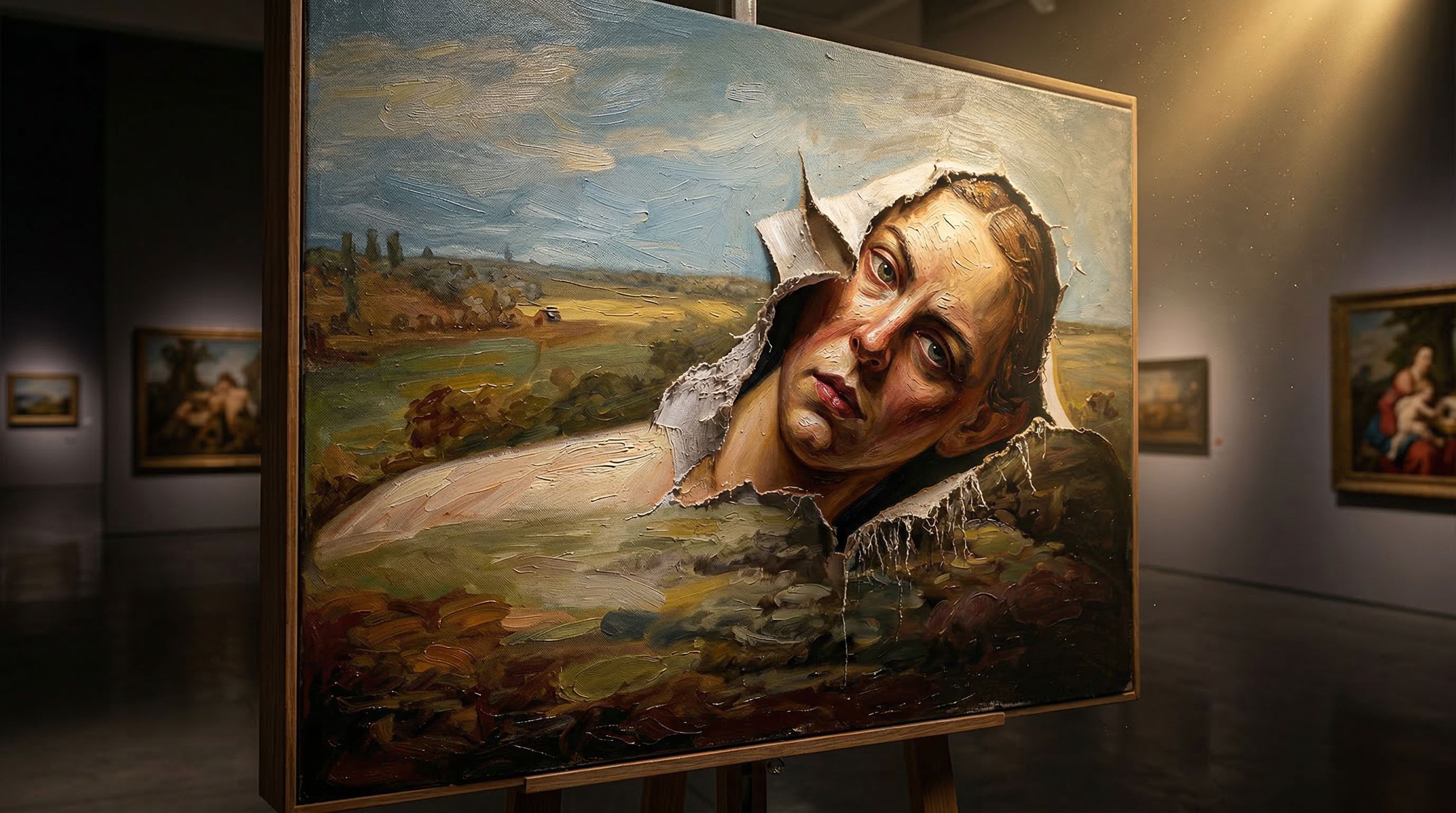Removed the canvas entirely and described a half-paint, half-real split down the center of the figure. Got body paint. Switched from a human subject to a tiger to eliminate the body-art genre entirely. Got a beautiful hyper-realistic painting of a tiger in a gallery, but still just one visual language. Reversed the direction completely, describing "a painting that is becoming three-dimensional." Got stunning trompe l'oeil: a painted face pushing out from a cracked canvas with gorgeous impasto texture. Technically impressive. But both sides were still oil paint.