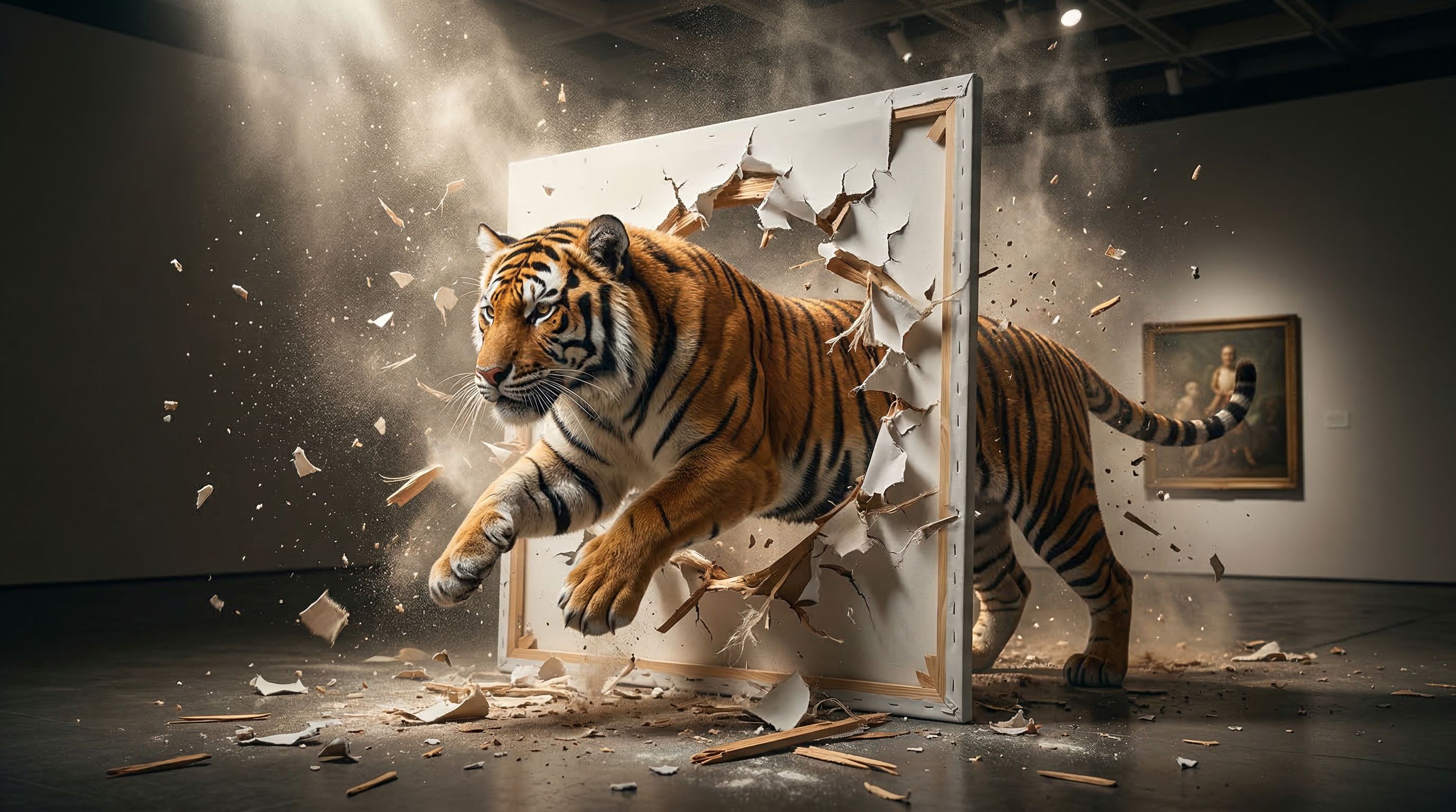 Imagen 4 went full action movie. The tiger wasn't transitioning from paint to fur. It was physically smashing through the canvas like a wall. Debris flying, surface cracking, fragments everywhere. Both sides photorealistic. No medium transition at all, but visually explosive. If I'd asked for "tiger breaking through a painting," this would have been the winner.