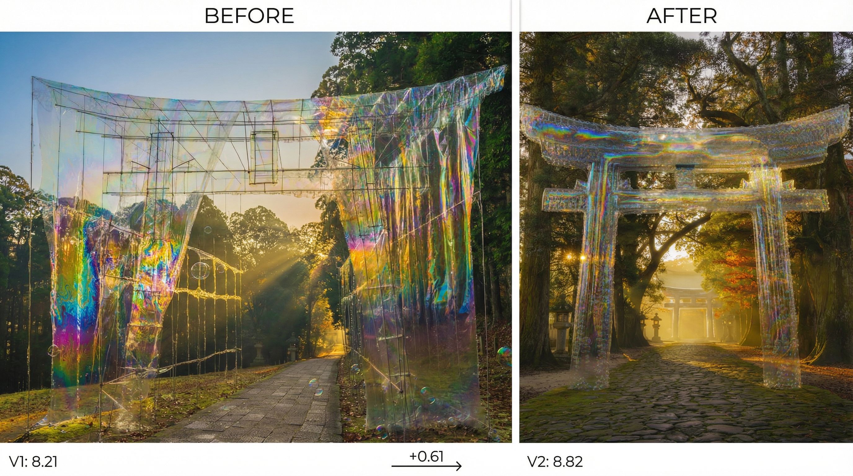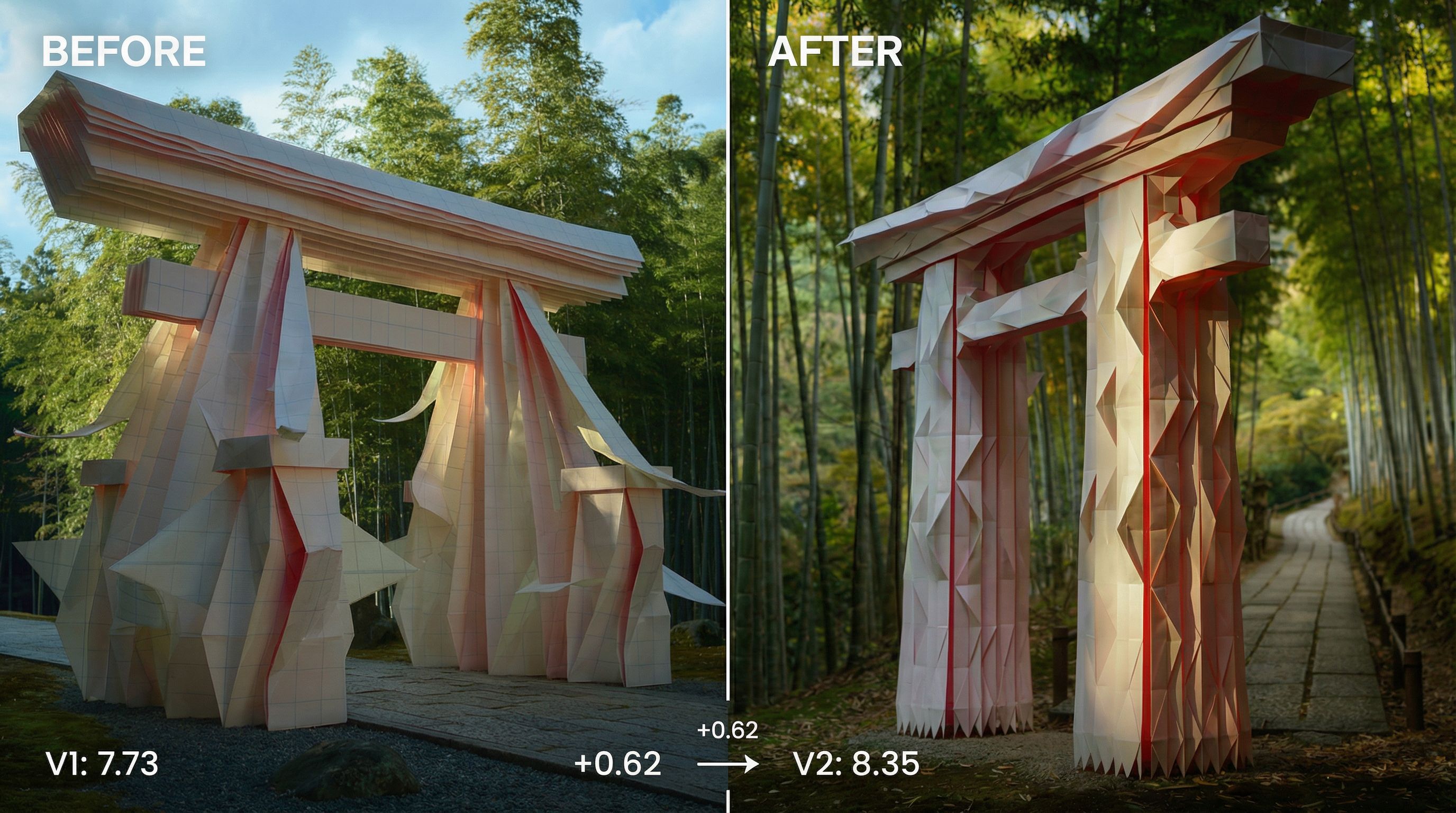 That phrase acts as an anchor. It tells the model "I know I'm asking you to build something impossible, but keep the architecture recognizable." All four V2 images maintained the torii shape. Consistency jumped a full point, from 7.5 to 8.5.