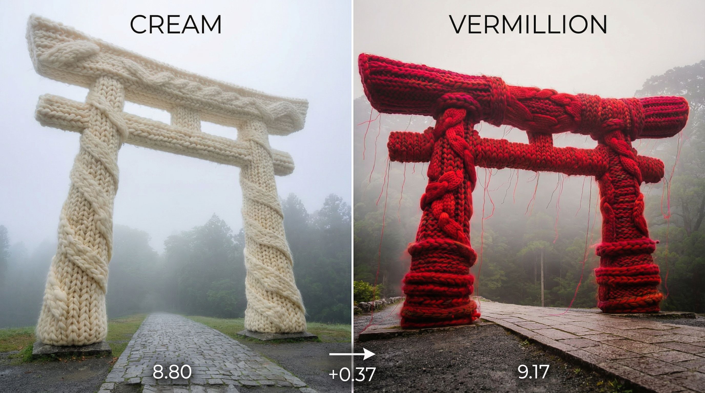 Same architecture. Same lighting. Same prompt structure. One word changed: the color. Engagement potential jumped a full point. Your brain recognizes "torii red" before it registers "knitted yarn." That half-second delay is the entire effect.