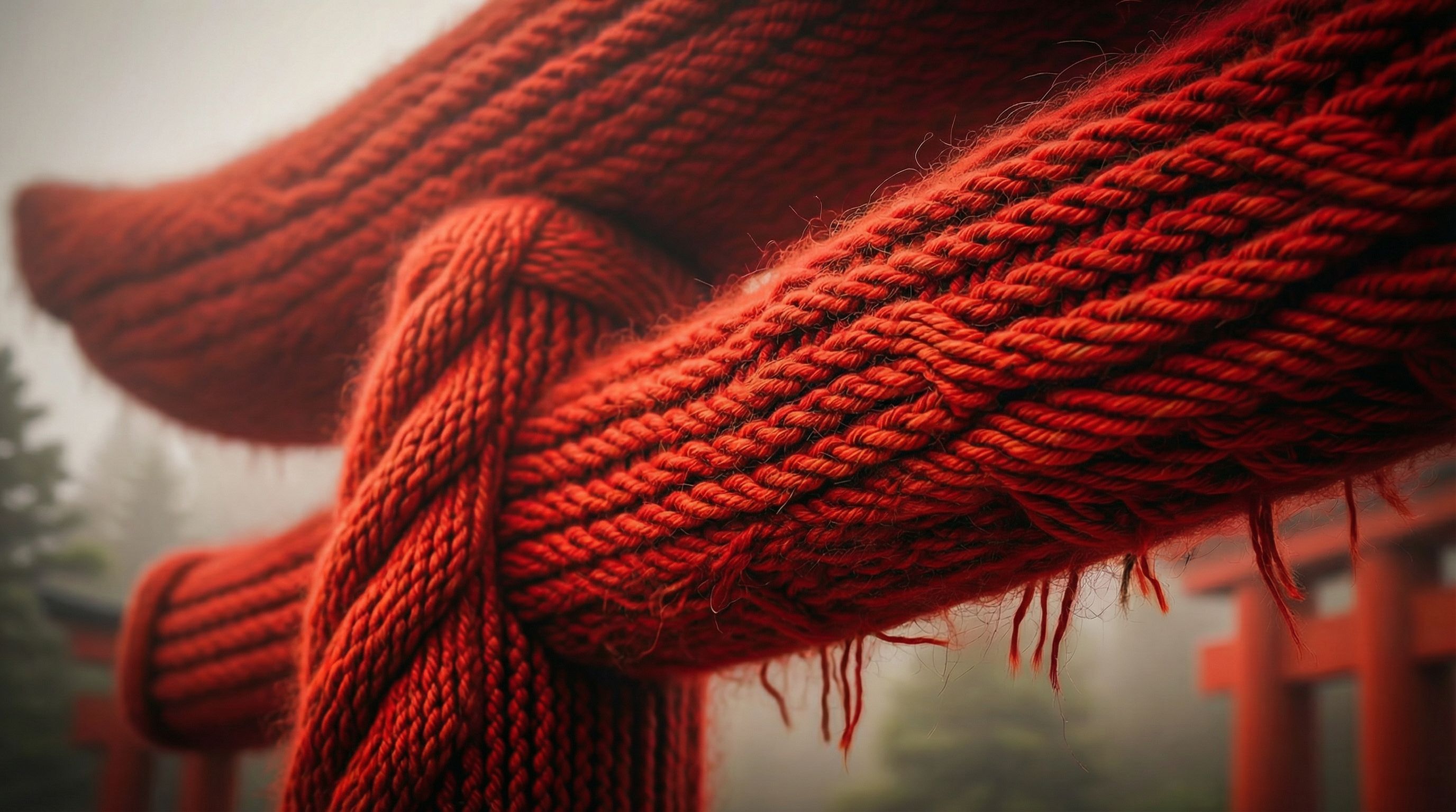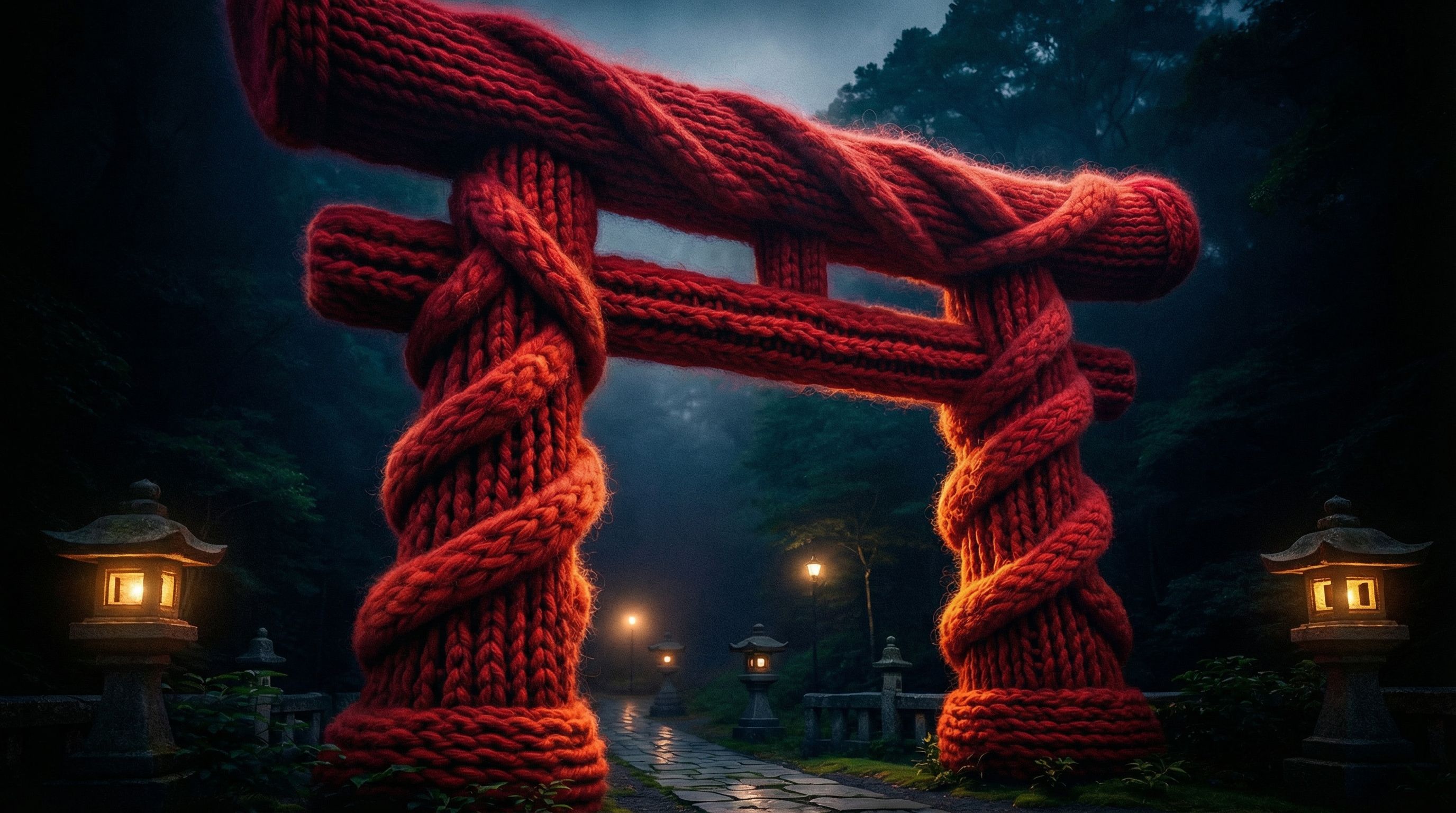 Your brain recognizes the color first. Red torii gate. Filed. Done. Then, half a second later, it registers the texture. Cable knit. Wool. Stitches.