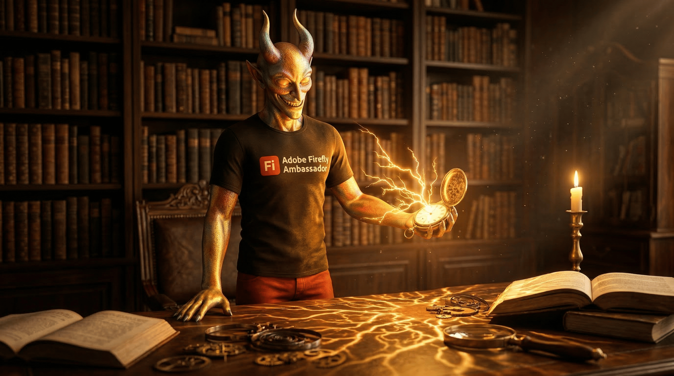 What NB Pro did with the pocket watch combined every behavioral signature that the lightbulb had constrained. The clockwork mechanism beneath the storm gave the lightning somewhere to go. Escaped light became escaped light across gears and springs, not just a flat table surface. The study and library environments that NB Pro defaults to felt natural with an antique pocket watch in a way they never did with a modern lightbulb. The warm caustic patterns that were fighting against the lightbulb's stock-photography-clean aesthetic became part of the pocket watch's inherent character.