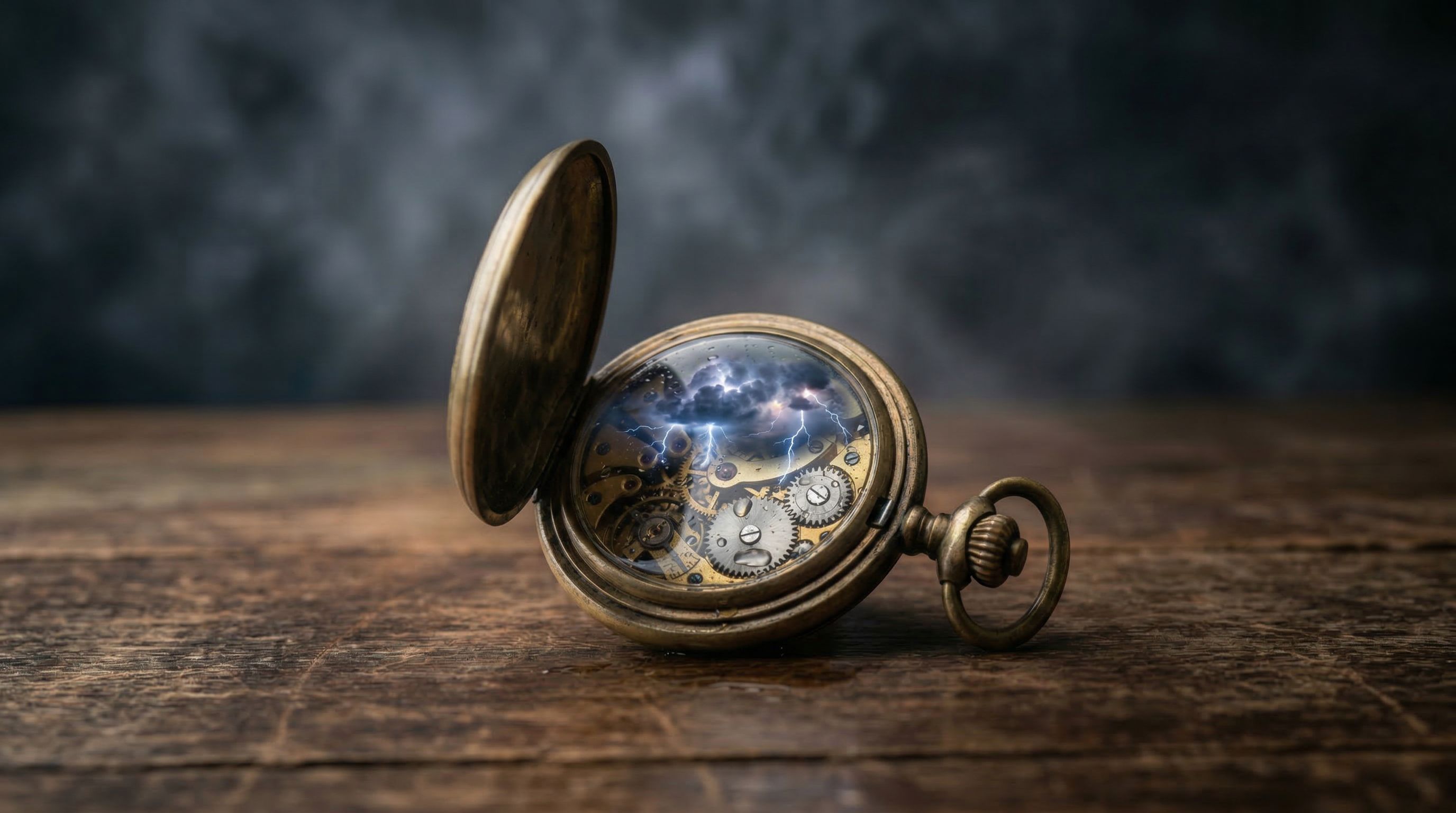 An open antique pocket watch sitting on a dark wooden table, inside the watch face a complete miniature thunderstorm is raging with tiny dark clouds and bright lightning bolts illuminating the watch glass from within, rain falling inside the watch with tiny puddles collecting on the watch mechanism, the lightning casts dramatic light through the watch crystal onto the table surface, macro photography, 85mm lens, shallow depth of field, dark moody background, atmospheric haze, professional product photographyNB Pro's four pocket watch images scored 9.23, 8.78, 8.78, and 8.78. Average: 8.89. The consistency score that was 7.63 on the lightbulb jumped dramatically. Three of four images scored identically. The model stabilized.